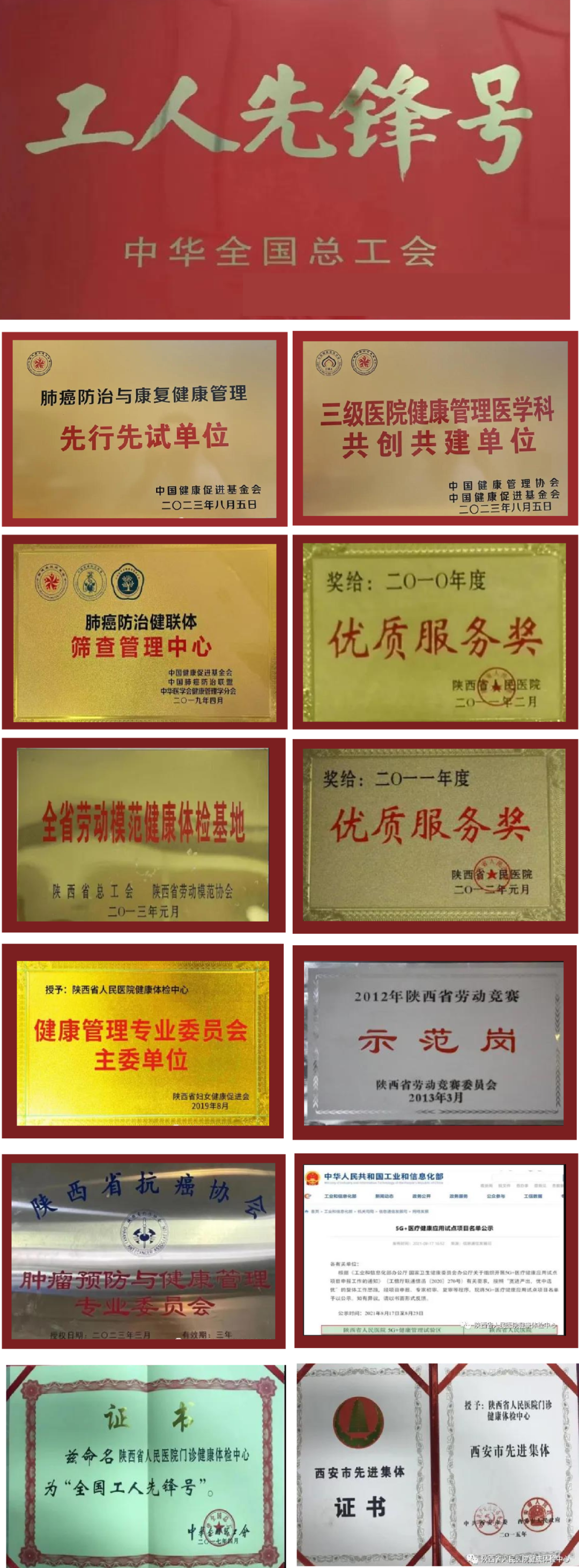 2007年 陕西省人民医院健康中心成立(友谊院区)2013年 中心被省总工会确立为“陕西省劳动模范健康体检基地”2015年 中心荣获西安市先进集体荣誉称号2017年 中心被全国总工会授予“全国工人先锋号”荣誉称号,系全国首家获此殊荣的体检机构2019年 中心被中国健康促进基金会确立为“肺癌防治健联体筛查管理中心”2019年 中心当选为陕西省妇女健康促进会健康管理专业委员会主委单位2021年 医院被国家工信部和国家卫健委确立为“5G+健康管理”陕西省牵头单位2023年 中心当选为陕西省抗癌协会肿瘤预防与健康管理专业委员会主委单位2023年 陕西省人民医院西咸院区健康体检中心成立,标志着健康体检中心正式开启“一院两区”的健康体检模式。